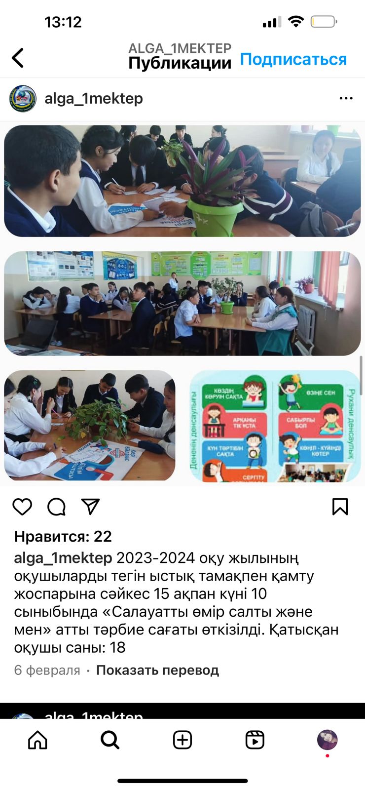 2023-2024 оқу жылының оқушыларды тегін ыстық тамақпен қамту жоспарына сәйкес 15 қаңтар күні 10 сыныбында «Салауатты өмір салты және мен» атты тәрбие сағаты өткізілді. Қатысқан оқушы саны: 22